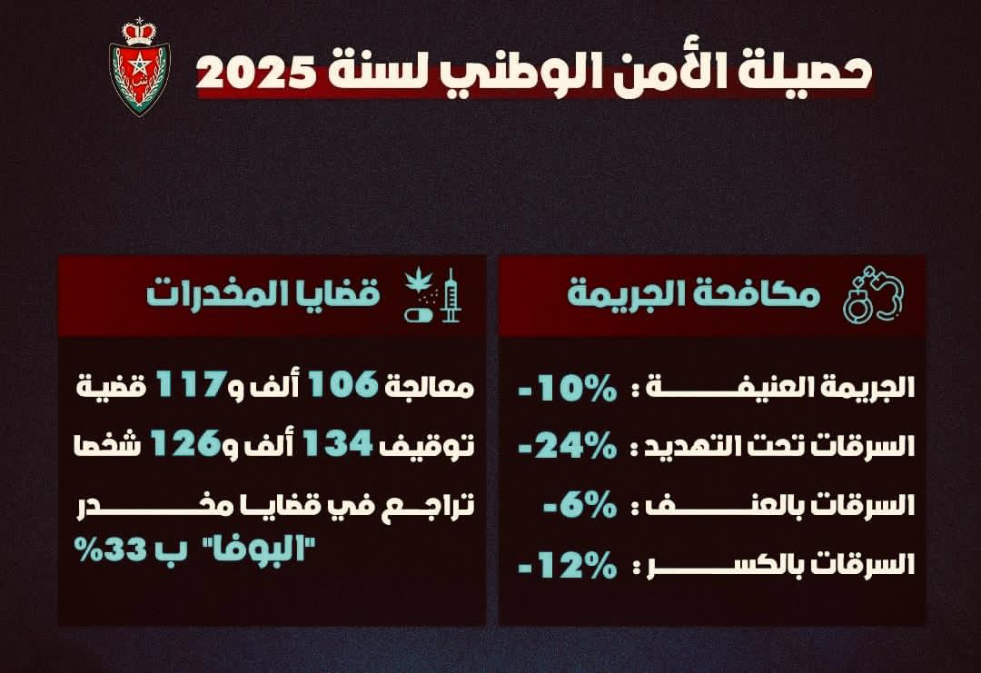 وتؤكد هذه الحصيلة أن المؤسسة الأمنية تواصل أداء مهامها في حماية الأشخاص والممتلكات، وتحصين الفضاء العام، في انسجام مع رهانات الاستقرار والأمن، وفي سياق وطني يفرض اليقظة الدائمة لمواجهة التحولات المتسارعة في أنماط الجريمة وأساليبها.