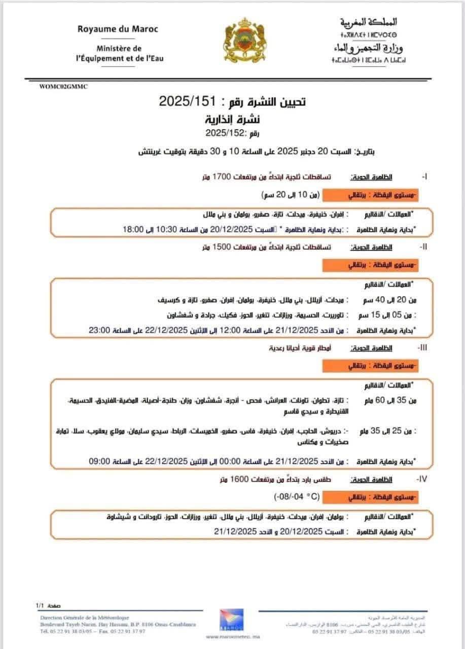 في ظل التقلبات الجوية الحادة التي تعرفها عدد من مناطق المملكة، أصدرت المديرية العامة للأرصاد الجوية نشرة إنذارية من مستوى يقظة متقدم، تحذر فيها من تساقطات ثلجية مهمة وأمطار قوية مصحوبة بطقس بارد، ابتداءً من يوم السبت 20 دجنبر 2025، وتمتد آثارها إلى غاية يومي الأحد والاثنين بعدد من الأقاليم.